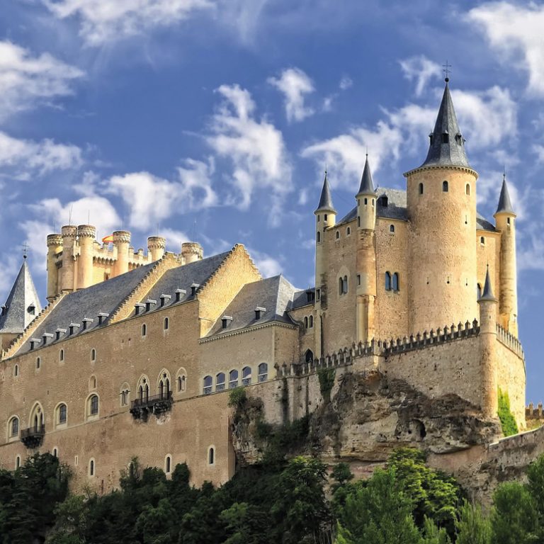 The Alcazar of Segovia is one of Spain's most visited monuments, a castle with a distinctive silhouette in an excellent location overlooking the Eresma River, symbolizing the old city of Segovia (a UNESCO World Heritage Site since 1985). Its layout is highly irregular and adapts to the hill on which it stands. It is known for its distinctive architecture and its use of slate in the roofs and towers. Its existence is documented as far back as the early 12th century. Throughout the Middle Ages, the Alcazar became one of the favorite residences of the Castilian kings. The ascension to the throne of the Trastámara monarchy brought new impetus in architectural, political, and symbolic realms. With this monarchy, it became a true palace, from which Isabella the Catholic emerged to be proclaimed queen of Castille in December 1474 in the main square of Segovia.