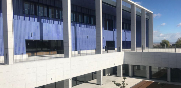 En el cobra especial protagonismo el granito Blanco Berrocal en acabado flameado. Se utilizó para los más de 3000 m2 de fachada ventilada, colocada sobre estructura auxiliar de aluminio en formatos 120x90x3 cm. y 120x45x3 cm., sistema que ofrece la mayor eficiencia energética posible.