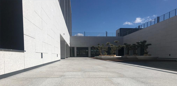 También se contó con este granito para los solados exteriores, en los mismos formatos y espesores, cubriendo un total de aproximadamente 1500 m2. Ocupando los solados anejos al edificio, preparados para un gran tránsito peatonal.