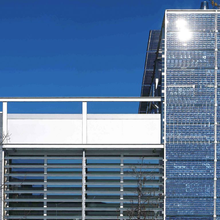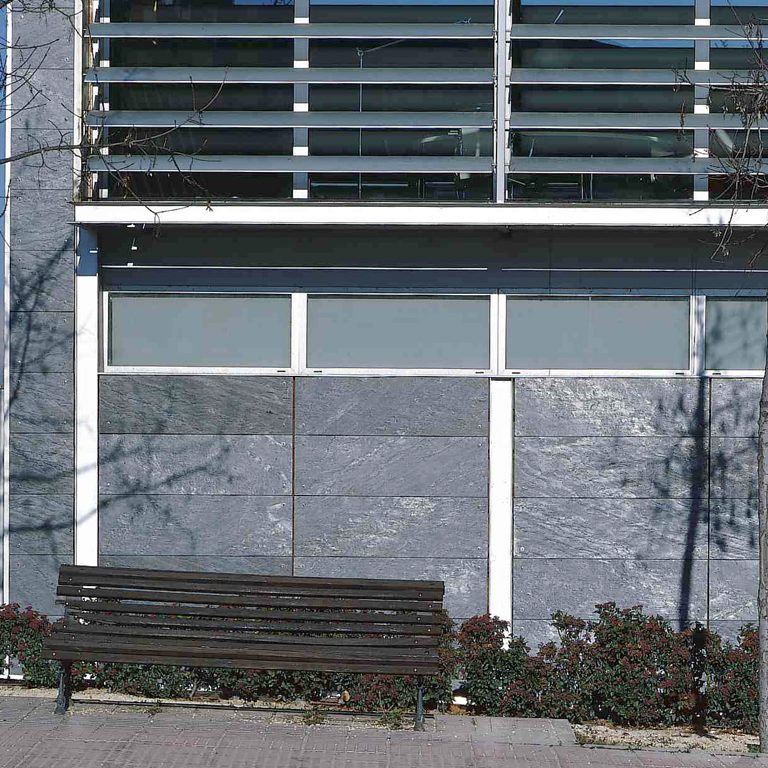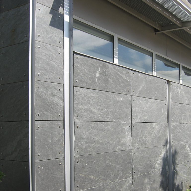 and bio-climatic commitment. Ventilated facade cladding, with grey Phyllite