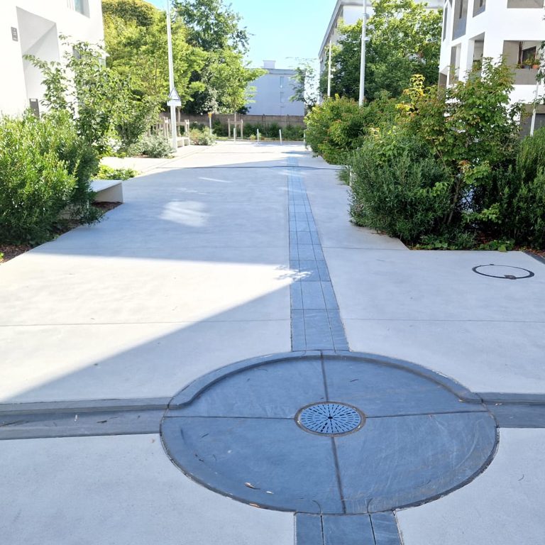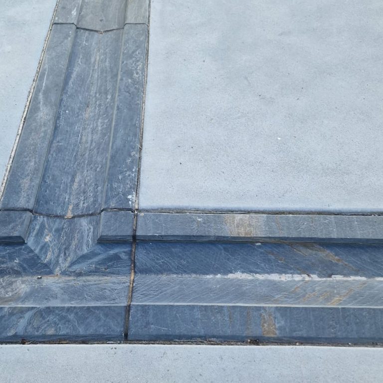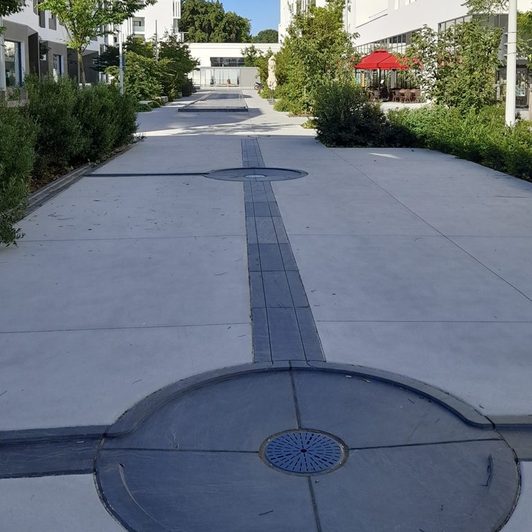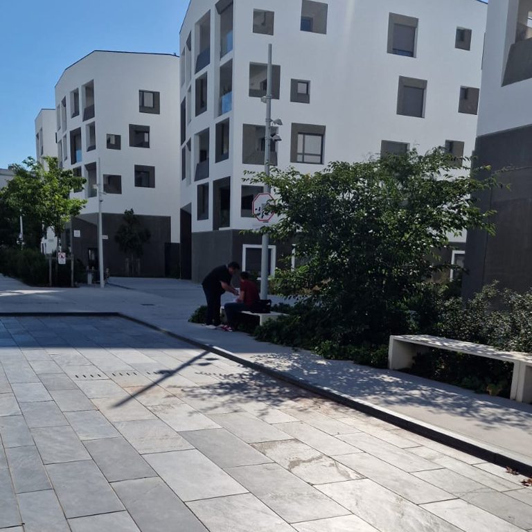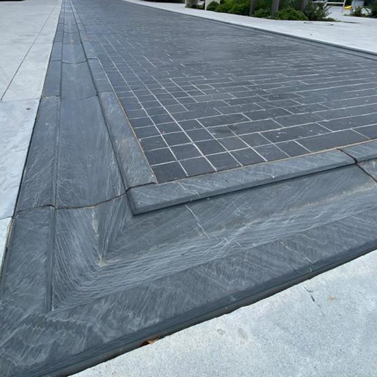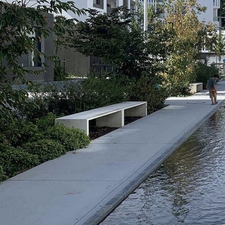 The "small metropolitan space", a pedestrian space that interconnects the tramway and the densely vegetated public spaces and that welcomes a mirror-like public fountain and another with round fountains at ground level. The water that emanates is recovered by an ingenious system of gutters to return to the closed circuit of the fountains. Naturpiedra JBERNARDOS supply between 2020 and 2021 brushed Phyllite Jbernardos for: