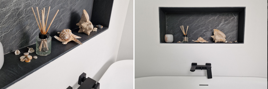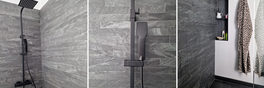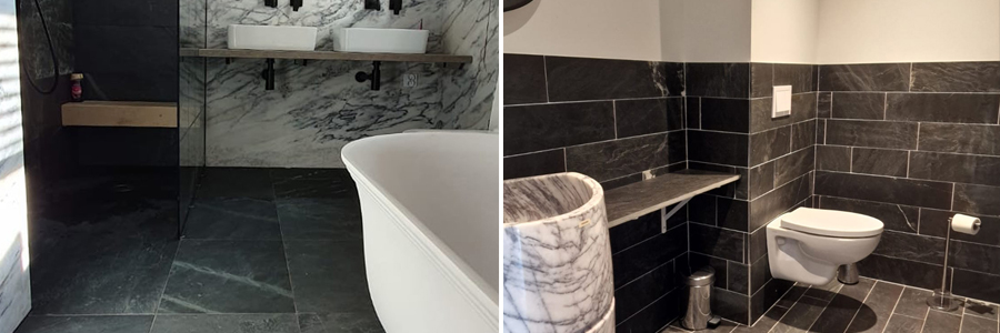 Uno de los usos más recurrentes de la Filita Gris Jbernardos en decoraciones interiores, es el de revestimiento de baños. Siendo un material de gran versatilidad que puede usarse en solado, revestimiento o piezas especiales como platos de ducha, encimeras, lavabos, baldas decorativas, etc.