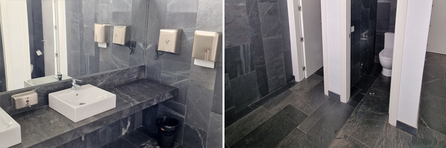 Otra característica que hace de la Filita Gris un material perfecto para el uso en baños es su escasa porosidad y buen comportamiento con los ambientes húmedos de los aseos, necesitando de muy poco mantenimiento. Protegiéndola adecuadamente al final de obra, con productos específicos, antimancha o hidrofugantes, nos será muy sencillo mantenerla limpia y luciendo como el primer día. Como toda piedra natural, esta envejecerá digna, lentamente y manteniendo su belleza inicial.