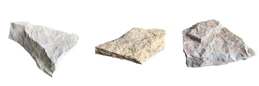 En concreto tres modelos de caliza irregular de tonos claros, indicados para colocar mampostería desconcertada o concertada.