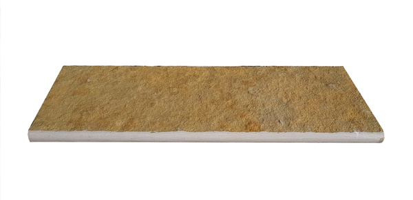 Un extraordinario material en agradable y antideslizante textura natural, en tonos pardo-amarillentos, rematado con un borde redondeado; que se pueden combinar con robustas baldosas de la misma piedra en formato 60x40x2 cm.