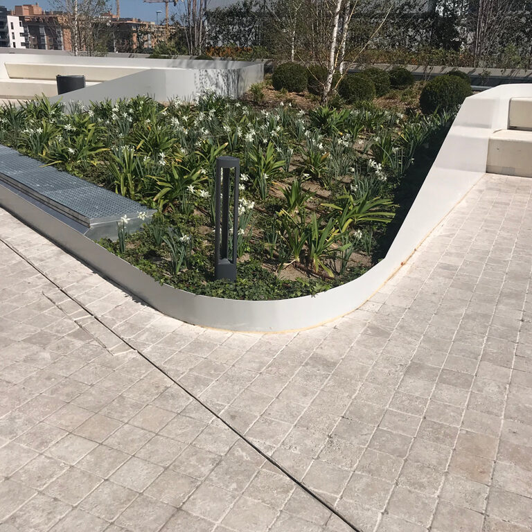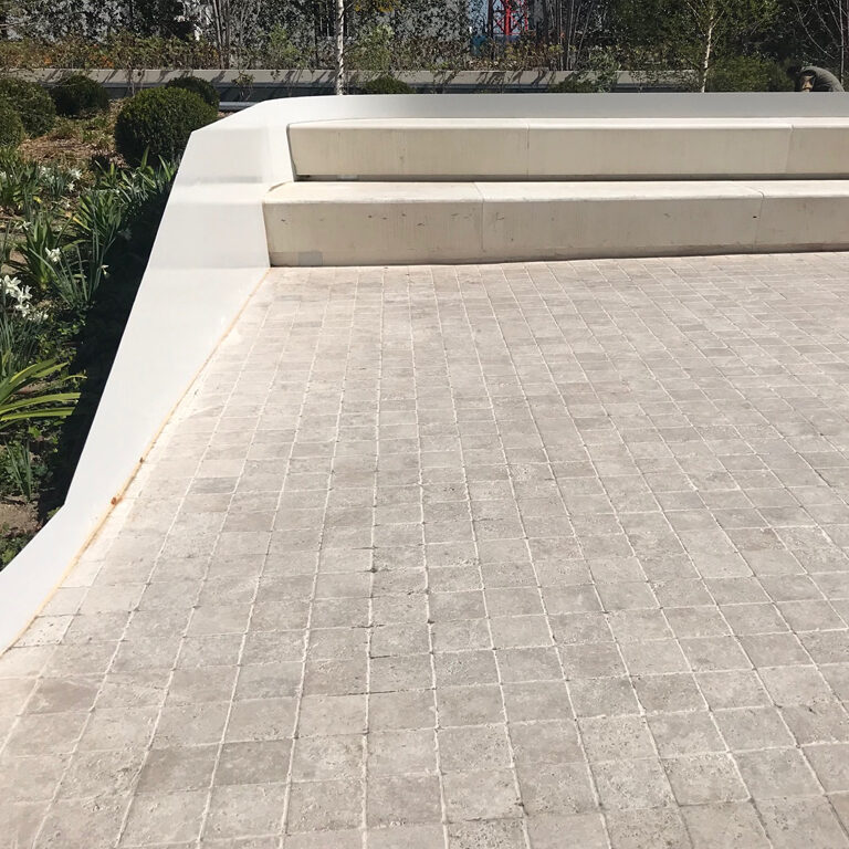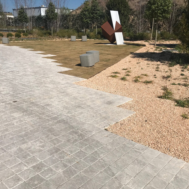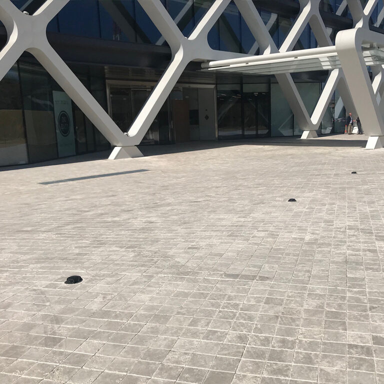 Unos 2700 m2 de suelo exterior en formato 15x15x3 y 4 cm. con acabado Tambor, envejecido por erosión con árido, consiguiendo un efecto de piedra antigua y resultado antideslizante.