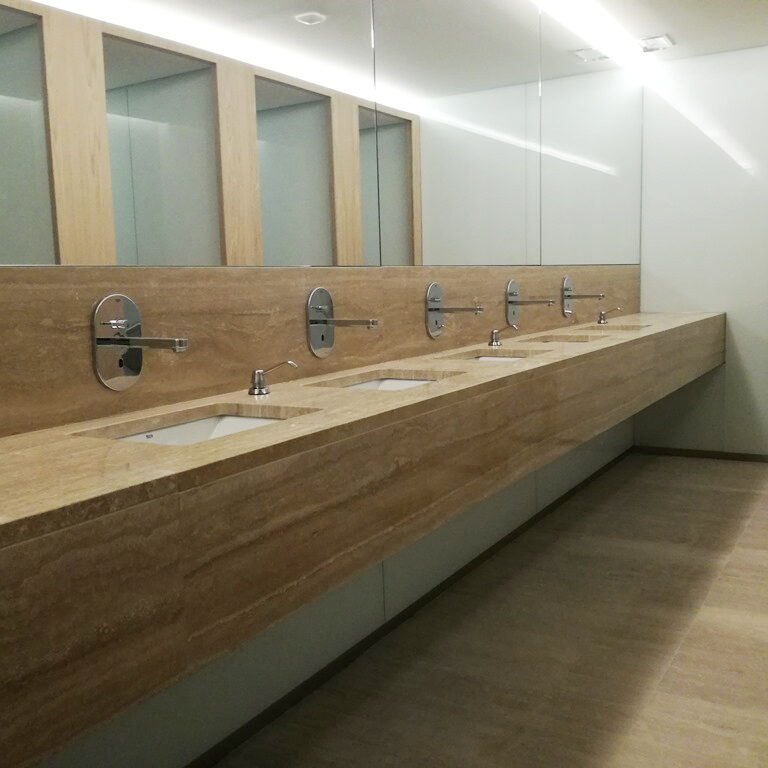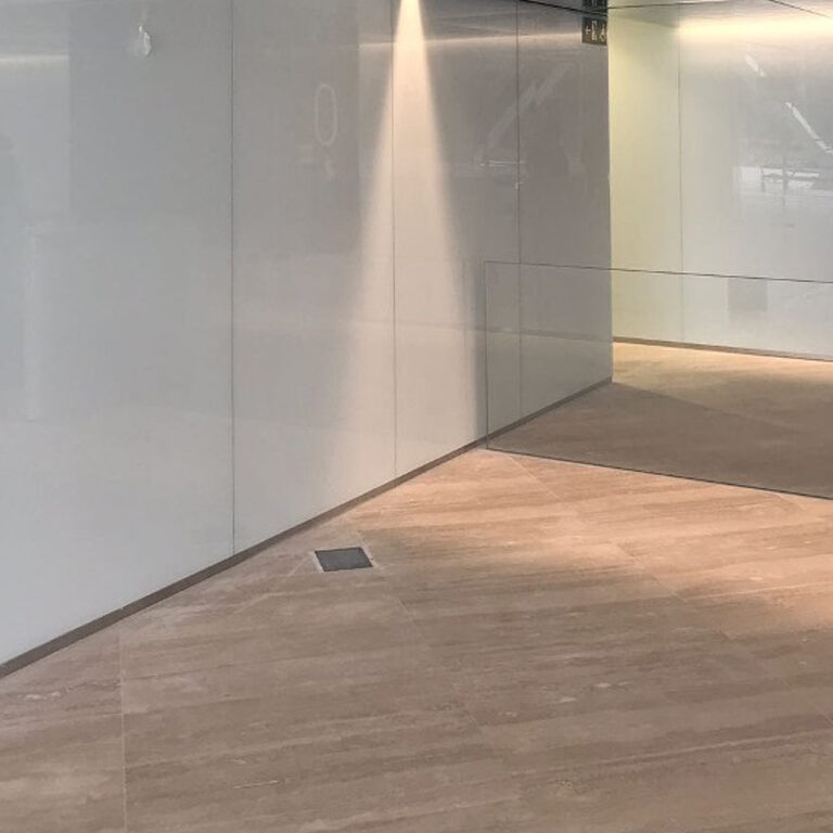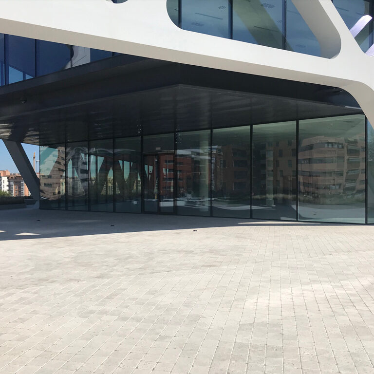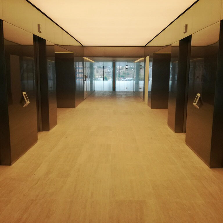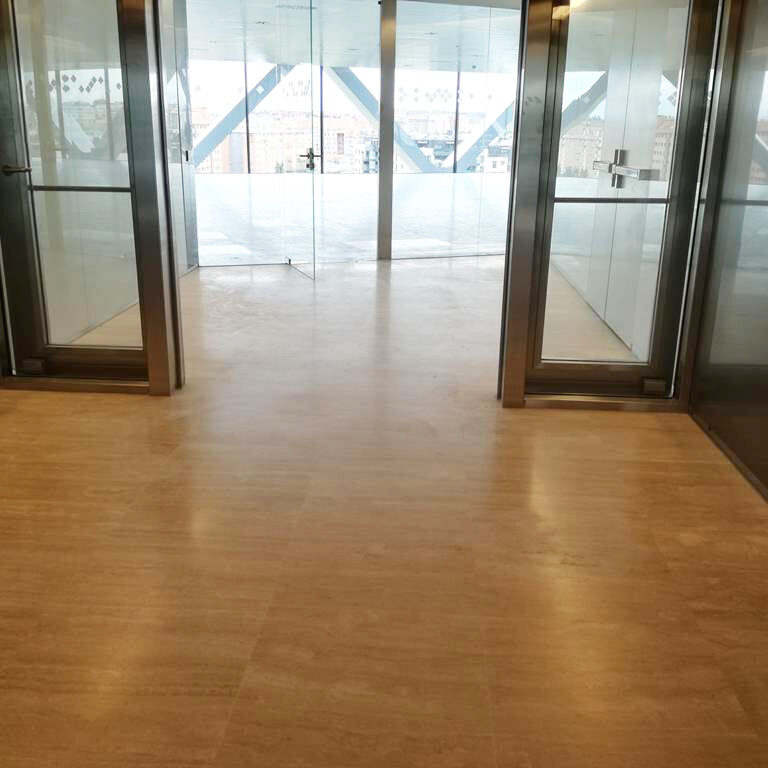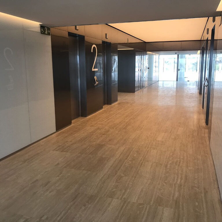 Este edificio de oficinas en Madrid, proyectado por el prestigioso estudio de arquitectura de Rafael de la Hoz, cuenta con un clásico y decorativo Travertino en el solado de sus zonas más transitadas y nobles.