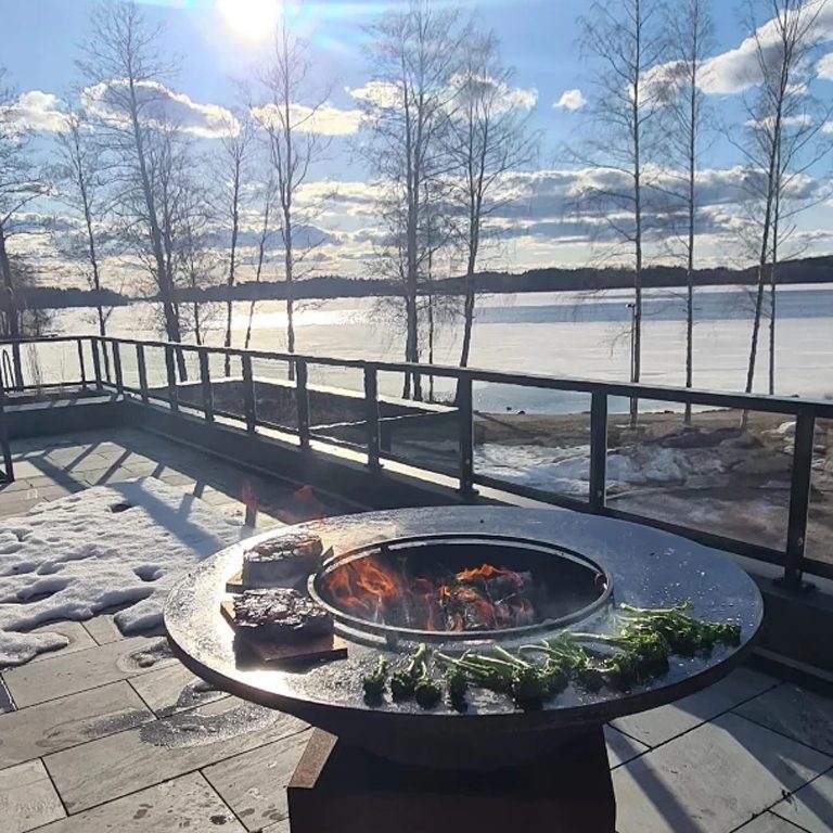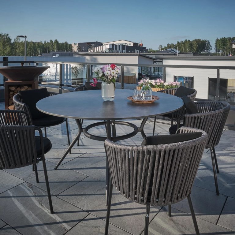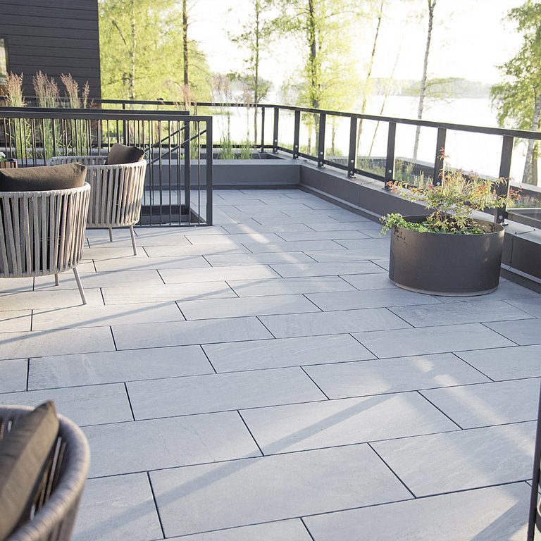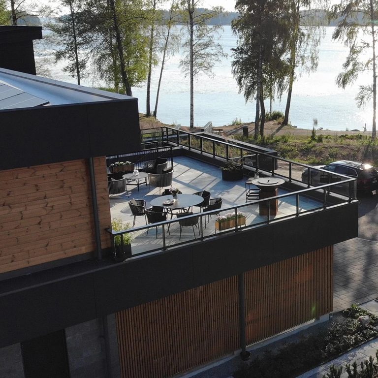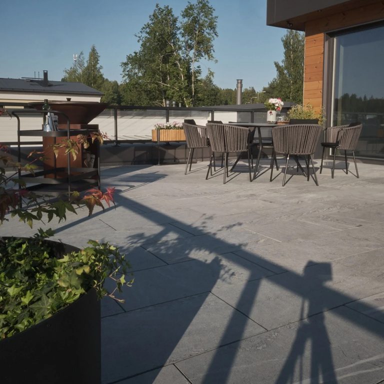 La casa continúa en el jardín, donde diferentes superficies y arreglos de piedra se encuentran con las plantas. Se podría decir que es «un jardín finlandés con un toque japonés».