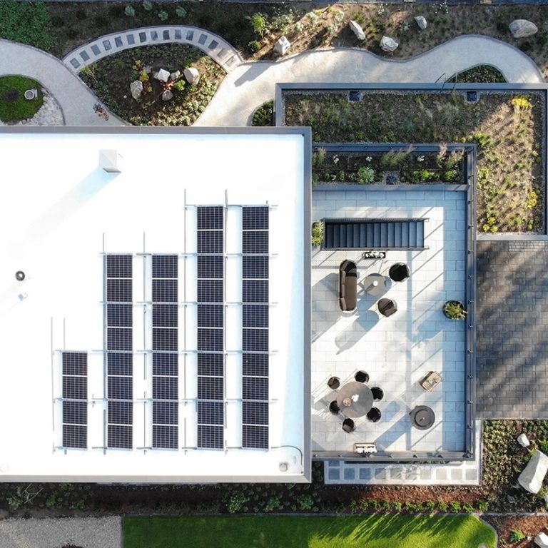 Construida con el claro objetivo de conseguir un edificio ecológico y eficiente en su consumo de energía. La huella de carbono de esta casa prefabricada de hormigón se reduce, por ejemplo, mediante un sistema de calefacción de bajas emisiones que consta de una bomba de calor aire-agua, calefacción por suelo radiante y una chimenea de almacenamiento. La propiedad cuenta con paneles solares en una cubierta plana pintada de blanco que la vuelve reflectante del calor, cubierta vegetal cuya humedad absorbe el calor extra y las plantas verdes limpian el aire de emisiones de dióxido de carbono; y una estación de carga de automóviles eléctricos.