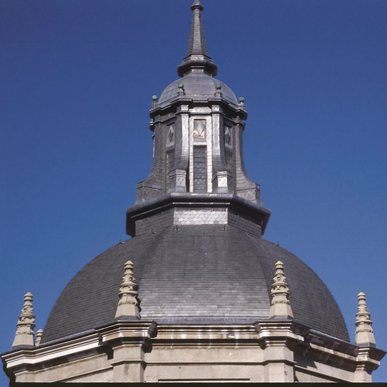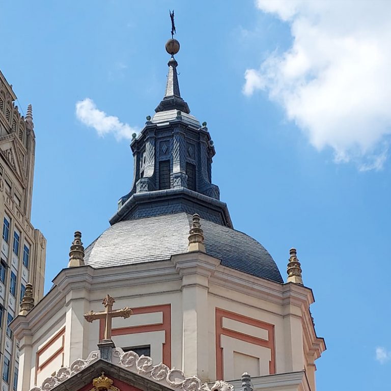 La arquitectura de la Iglesia de las Calatravas destaca por su riqueza decorativa, el uso de elementos escultóricos y la cuidadosa disposición de los detalles arquitectónicos propios del estilo barroco. Es un ejemplo impresionante del legado arquitectónico de la época en Madrid. Vista desde el exterior, la cúpula es octogonal, cubierta con pizarra de Bernardos cuyo color oscuro contrasta con la fachada y le da un aspecto sobrio y elegante al edificio. El contraste entre la ornamentación barroca y el color oscuro y uniforme de la pizarra crea un efecto visual impactante y resalta la belleza de la arquitectura de la iglesia.