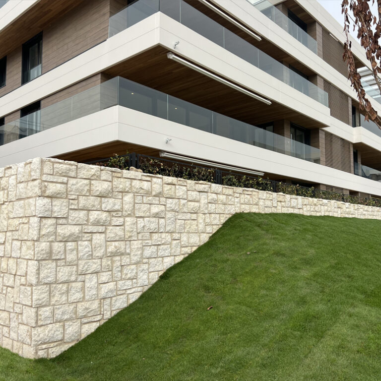 Urbanización denominada El Jardín de La Moraleja, donde NATURPIEDRA ha suministrado y colocado más de 20.000m2 de mampostería de caliza en muros repartidos en dos promociones, 262 viviendas y 188 viviendas, con su grupo de canteros propios, especialistas en este tipo de colocación tan especializada, con un resultado espectacular.