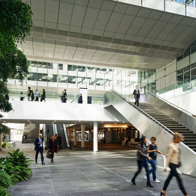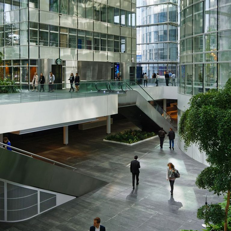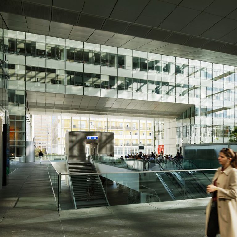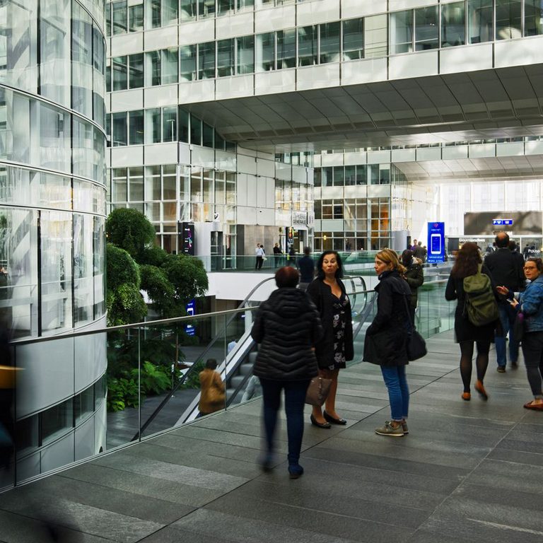El atrio es una compleja esplanada de 3 niveles y que se conecta con el espacio abierto Charles de Gaulle en su parte más alta. Todos los espacios de los edificios están accesibles, los restaurantes, los servicios, y al centro de conferencias dónde conviven a diario unas 10 000 personas. Los locales técnicos, los archivos, las cocinas, parkings se encuentran en los niveles inferiores están. Durante la primavera 2021 se procedió al cambio del sistema de huellas metálicas que soportaban la piedra Offerdal que fue colocada hace unos 20 años en las escaleras de las zonas comunes, y Naturpiedra ha suministrado las piedra (huellas) para la rehabilitación de estas escaleras con el mismo tipo de piedra y de acabado, natural/calibrado en espesor 3 cm.