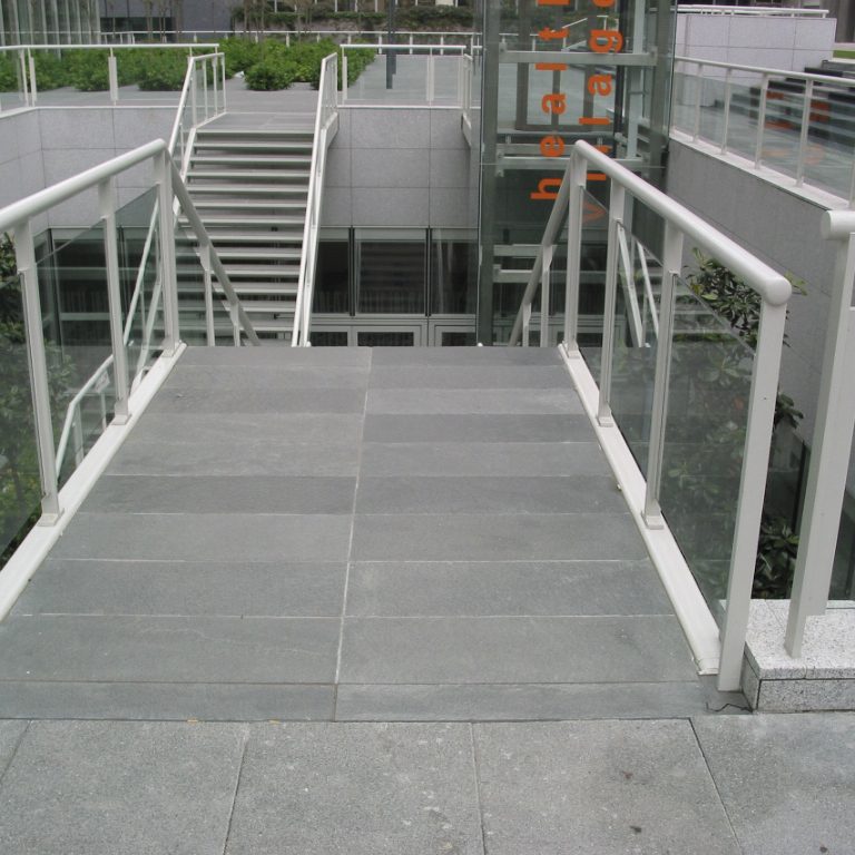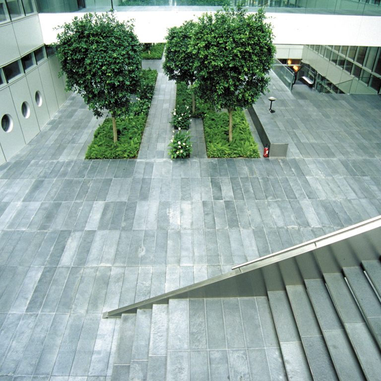 La Cuarcita Offerdal Jbernardos (tiene una edad geológica 650 millones de años) fue seleccionada hace 20 años para todos los solados del atrio y las escaleras por sus propiedades antideslizantes y su resistencia al desgaste, ideal para áreas de mucho tráfico peatonal como es este caso. Una piedra dura y robusta con una superficie gris oscuro ligeramente ondulada y alto contenido en Mica que refleja la luz. Este tipo de piedra ha sido utilizada en todo el mundo en los proyectos como el Van Abbemuseum en Eindhoven, la Scène Nationale en Guadalupe, el templo budista Tsz Shan en Hong Kong, Valby Water Centro Cultural en Copenhague, Palanga SPA y Design Hotel en Lituania, Østersund Square, Vallentuna Biblioteca y Casa Cultural, Pabellón de Caza Zlatan Ibrahimovic’s en Åre, Stor‑ord Hotel en Ålesund, Djurgårdsbrons Sea café en Estocolmo, Älvsjö Square y Paseo Marítimo en Barcelona.
