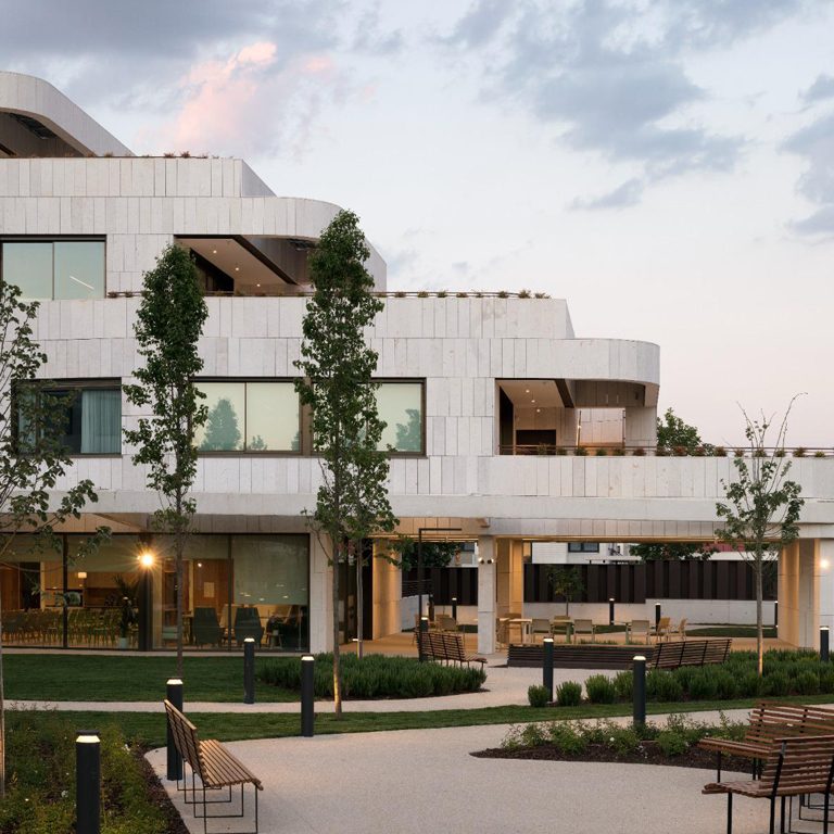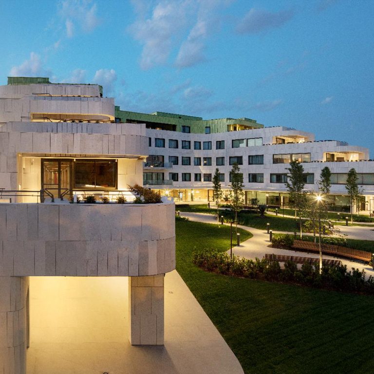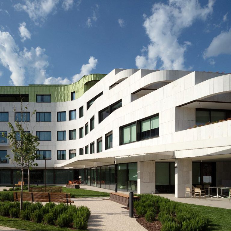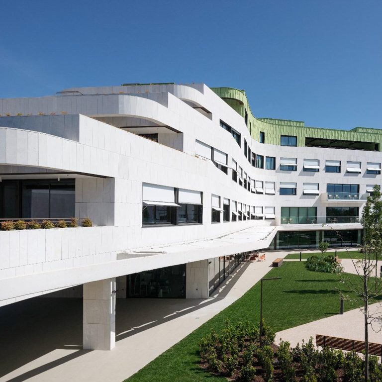 Fachada ventilada de caliza Hueso Naturpiedra con 3 acabados superficiales distintos: amolada, abujardada y escafilada, de 90x30x3, con anclaje puntual oculto de acero inoxidable, y colocada a matajunta de manera vertical. Total: 4.840m2.