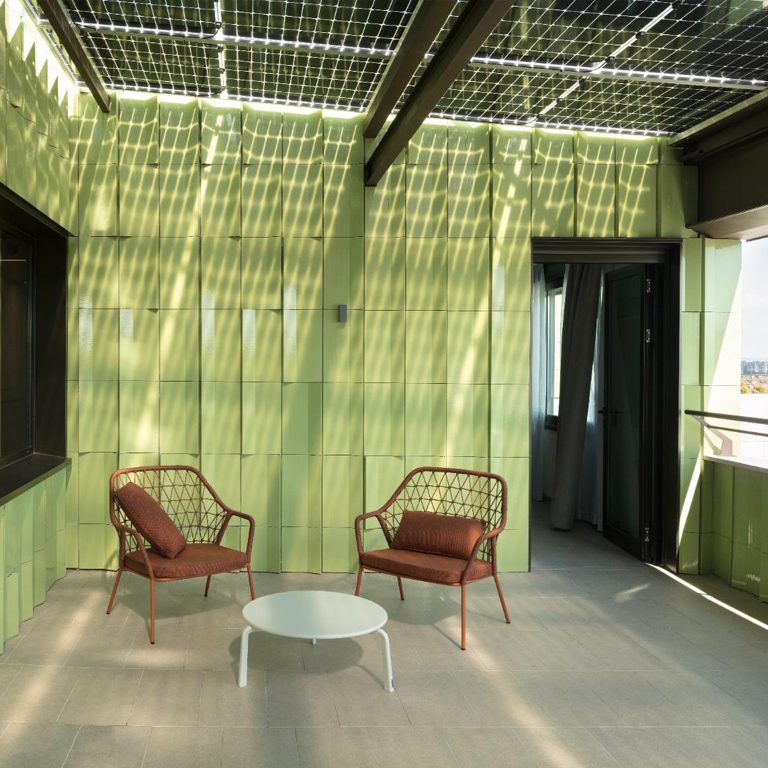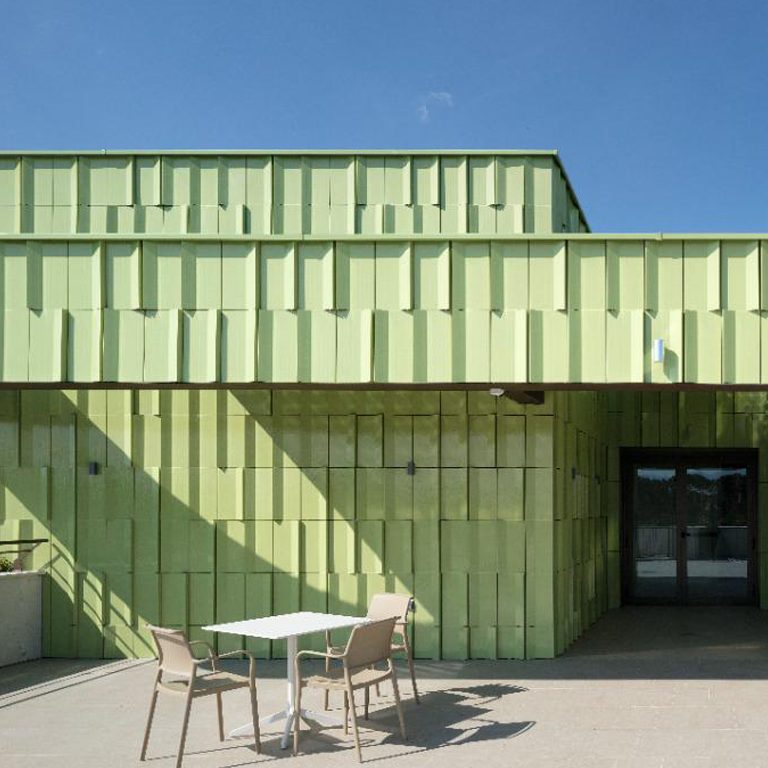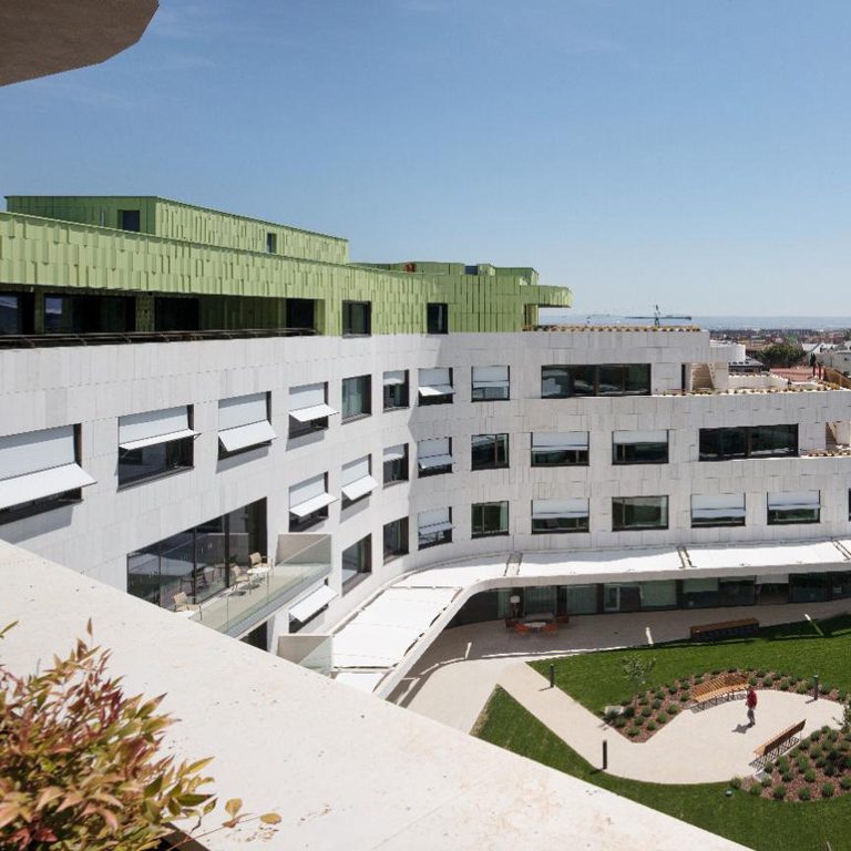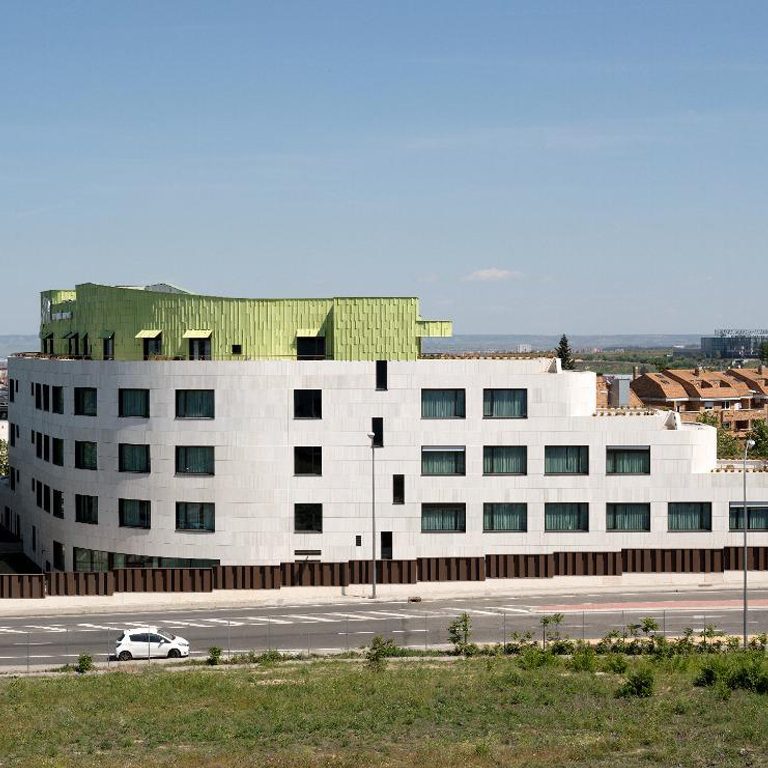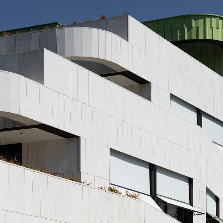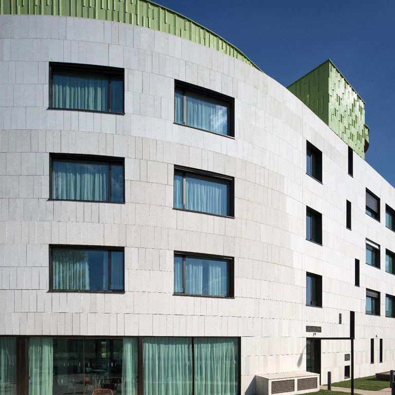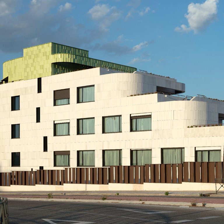 La colocación de las fachadas ventiladas en Caliza Hueso Naturpiedra y cerámica (tonos verdes), han sido ejecutadas por los equipos propios de colocación de Naturpiedra Obras.