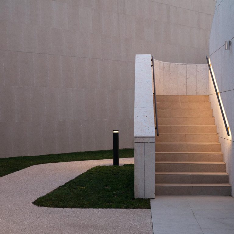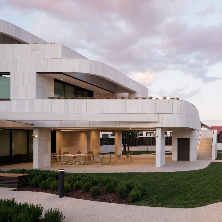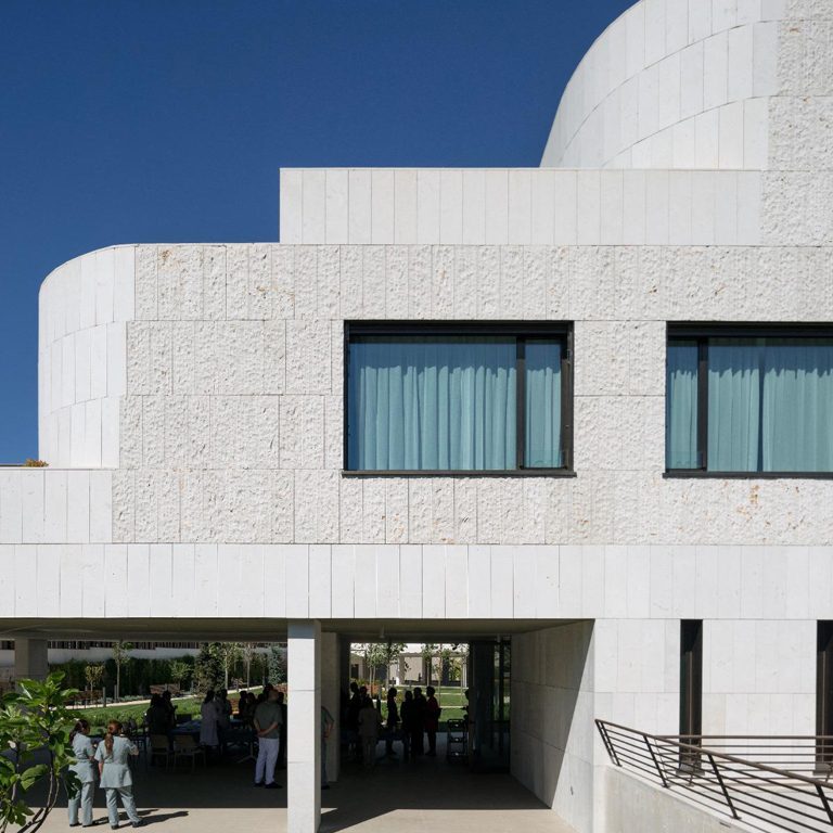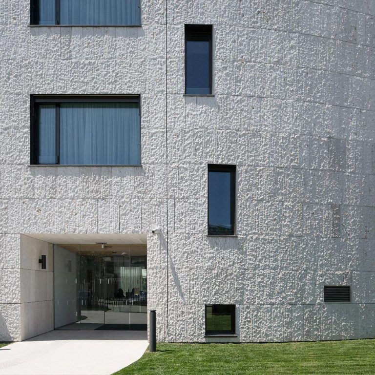 Tiene varias zonas en curva revestidas de piedra, que se resuelve con la colocación de la piedra en vertical. Otra de las peculiaridades de la fachada es la combinación de 3 terminaciones superficiales de la piedra. Dos de ellas son bastante comunes: el amolado y el abujardado. La otra terminación es el escafilado, que dota a la piedra de un aspecto muy rugoso que contrasta con los otros dos acabados. La piedra escafilada adquiere un aspecto visual muy potente en la fachada, que incluso crea efectos de sombras con la incidencia del sol.