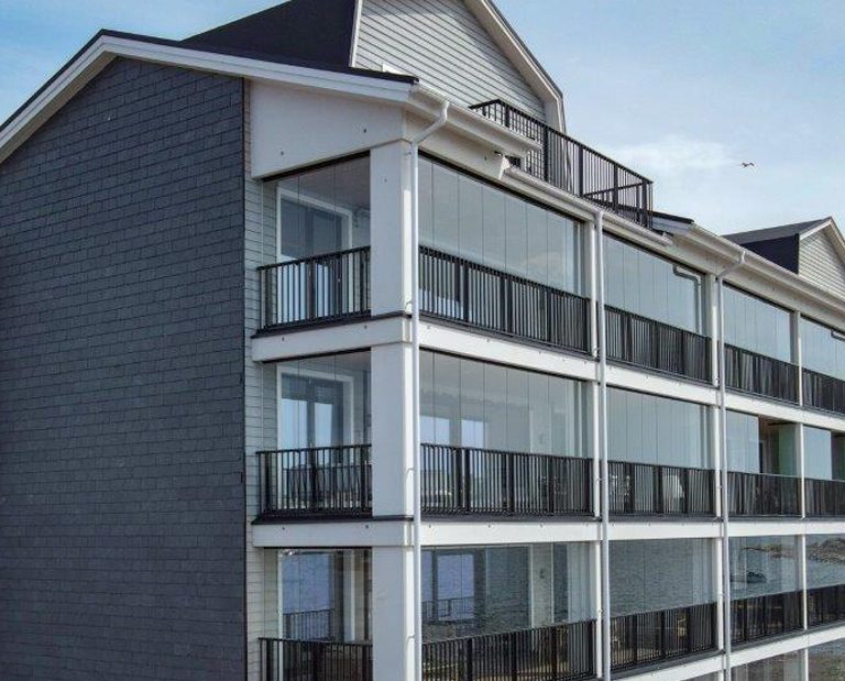 Las fachadas de pizarra de los edificios de apartamentos crean el contraste necesario en la paleta de colores. Los paños de piedra natural oscura dan luz y sombra de forma hermosa. Junto con las superficies de fachada claras y la madera tratada térmicamente utilizada en los techos, se crea un aspecto atemporal que respeta el entorno. La piedra es un elemento dominante en este proyecto, ya que toda la costa está pavimentada con piedras.