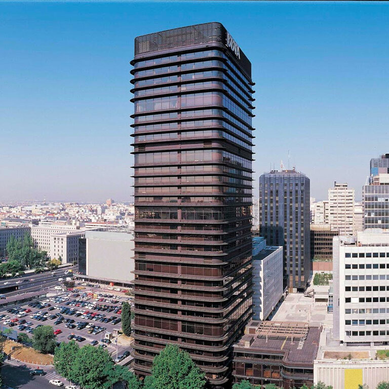 Este rascacielos es uno de los edificios más emblemáticos de la arquitectura española del pasado siglo, originariamente sede del Banco de Bilbao, ya contaba con chapados de Filita Gris de las canteras de Bernardos, en grandes despieces, en las zonas comunes y nobles del edificio.