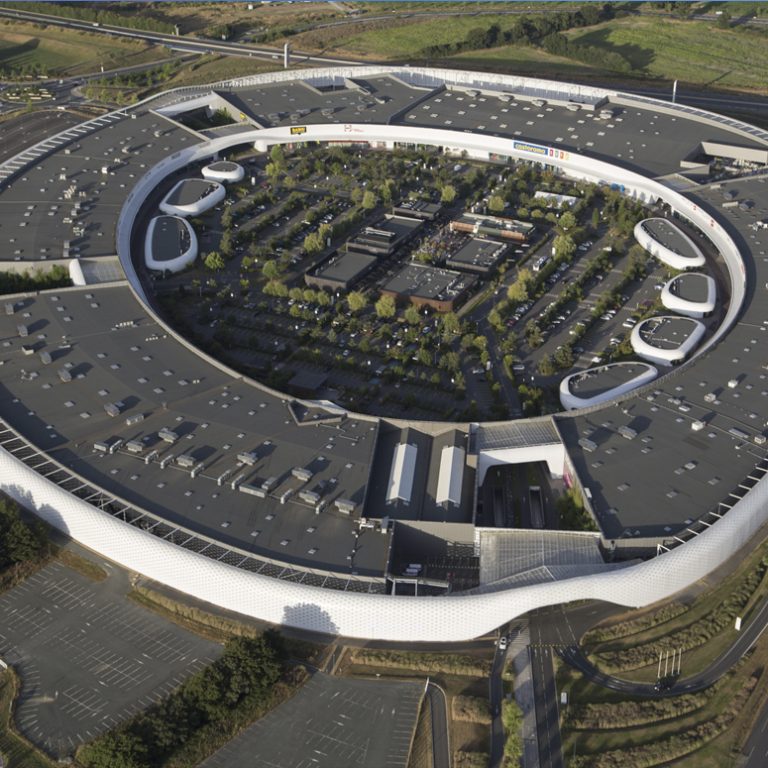 El Centro Comercial con su forma elíptica, ofrece un desarrollo paisajístico excepcional. Gracias a la continuidad de sus curvas, cada comercio tiene la “mejor ubicación” y su arquitectura espectacular busca ofrecer una nueva experiencia de compra. Sin embargo, el gigantismo aquí es introvertido y no interfiere con el paisaje. La elipse brinda dos fachadas nobles: una orientada hacia el interior y otra hacia la ciudad, con entradas amplias que enmarcan las vistas.