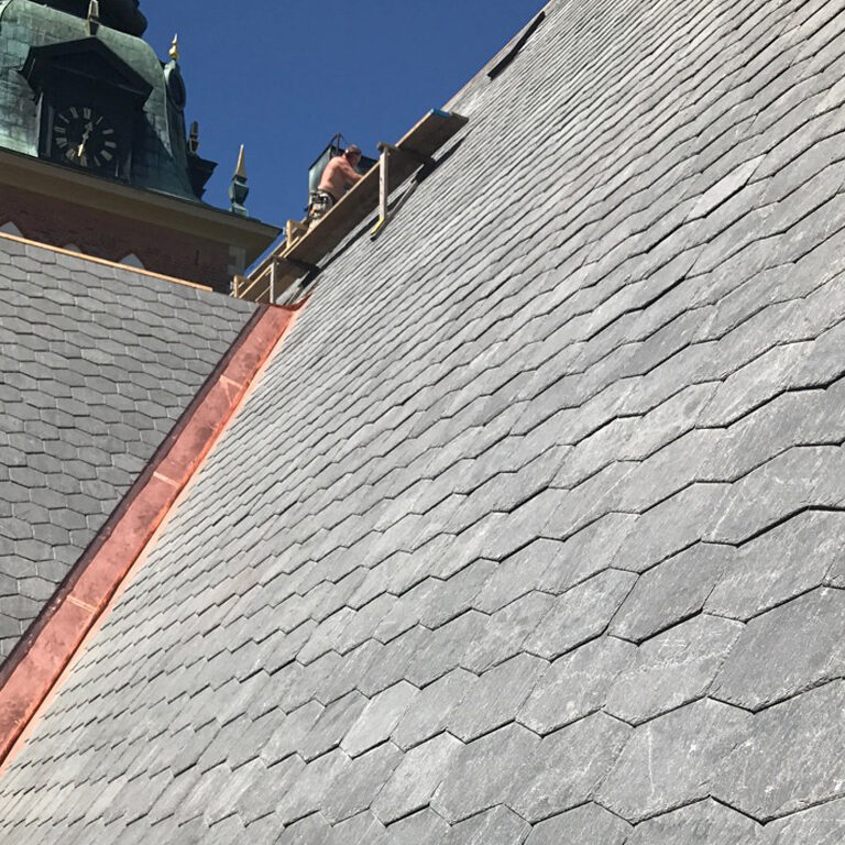 La cantera se puso manos a la obra para desarrollar las herramientas necesarias para poder producir una forma de pizarra poco común, tipo pico pala, pero con líneas rectas. Del saber hacer ancestral de las canteras de Bernardos y del empeño de los arquitectos suecos por salvaguardar el patrimonio buscando soluciones cualitativas y duraderas, nació este maravilloso resultado dónde la Filita luce por su color plomo y su veteado característico.