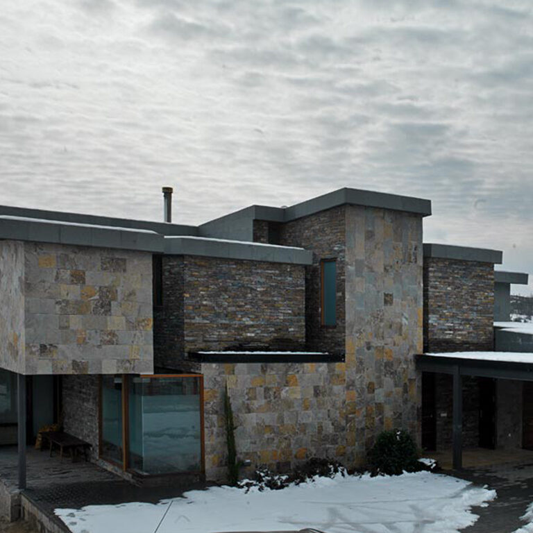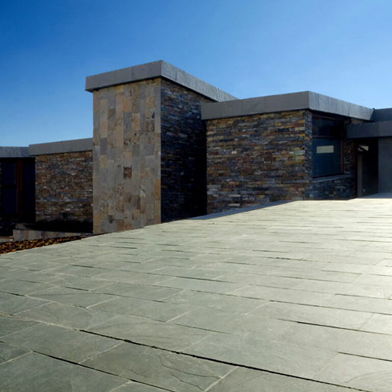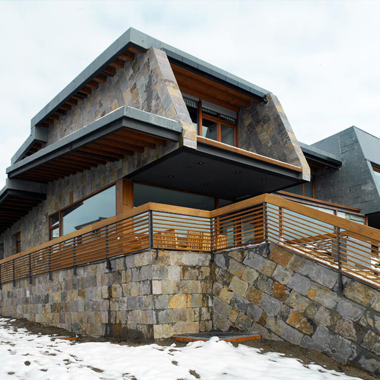 Cubierta transitable de pizarra Gris Verde Encina, con una pendiente mínima, que al almacenar la nieve, aumenta la proteción térmica de la misma.