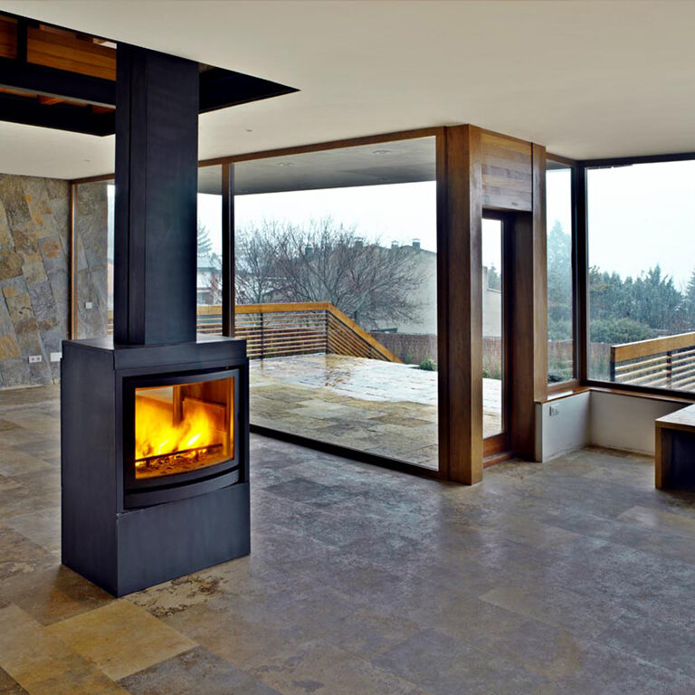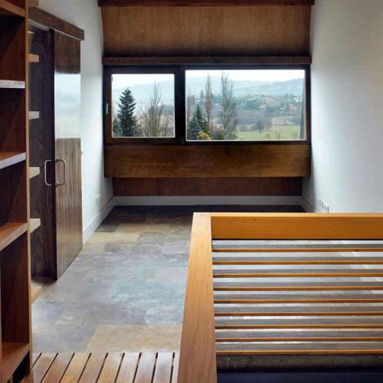 En esta vivienda de montaña de Navacerrada, en medio de la sierra de Guadarrama, adquiere un total protagonismo la piedra natural. La solidez, aislamiento y adecuación al entorno que ofrecen las distintas piedra colocadas, fue tomado en cuenta en el proyecto de Manuel Pérez Romero, y en todas las zonas de la vivienda cuentan con revestimientos petreos.
