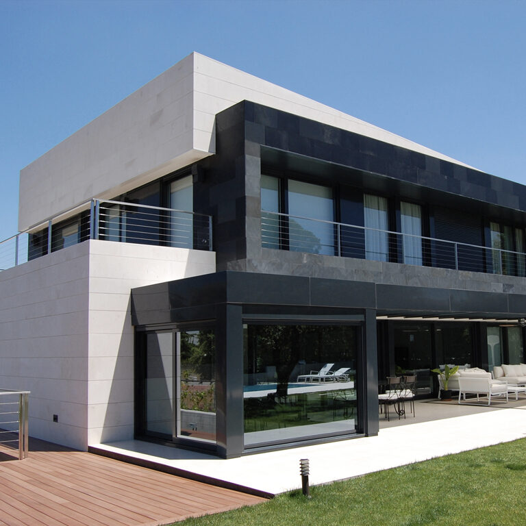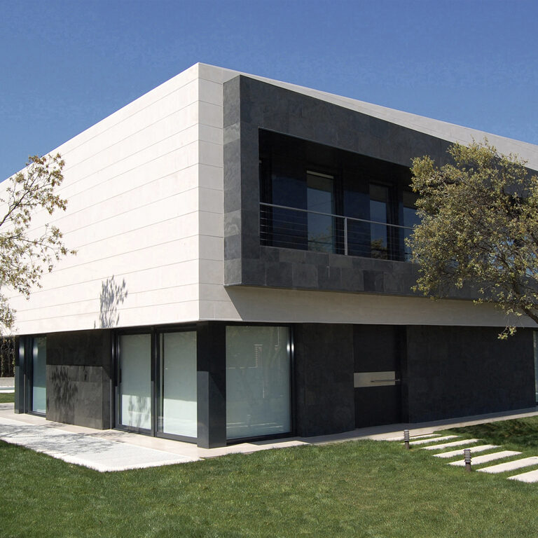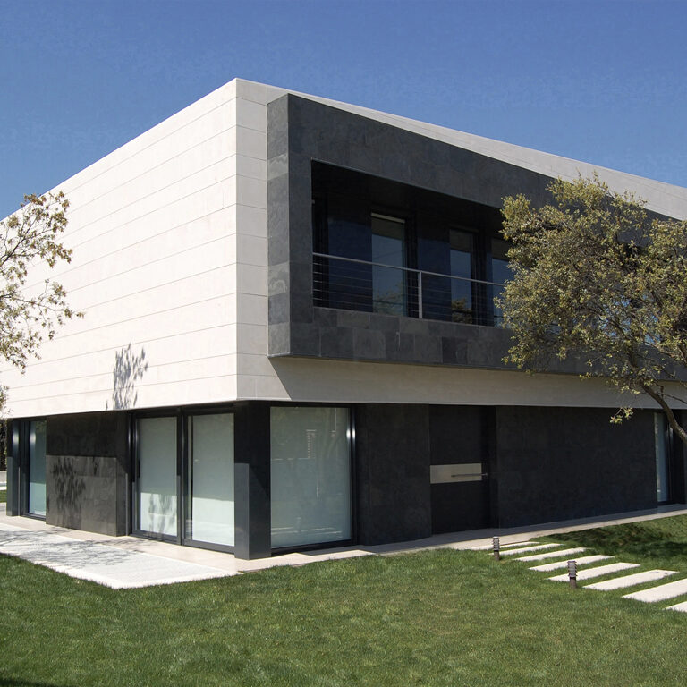 Destacan sus volúmenes, revestidos con chapado amorterado y asegurado con anclaje de acero inoxidable, ejecutados por los equipos de colocación propios de Naturpiedra Obras; en tonos claros de la Caliza Atenas Jbernardos apomazada, y tonos oscuros en Pizarra Negro Ébano Jbernardos en textura natural.