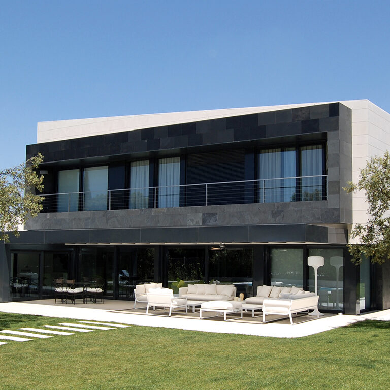 Vivienda Unifamiliar de diseño moderno, con más de 500 m2, completamente abierta al jardín exterior. La vivienda se desarrolla a partir de un plano quebrado que va generando los distintos espacios. Con una jardinera interior a doble altura que sube junto a la escalera. Ubicado en la población madrileña de Pozuelo de Alarcón, en la urbanización Villas de Monteclaro.