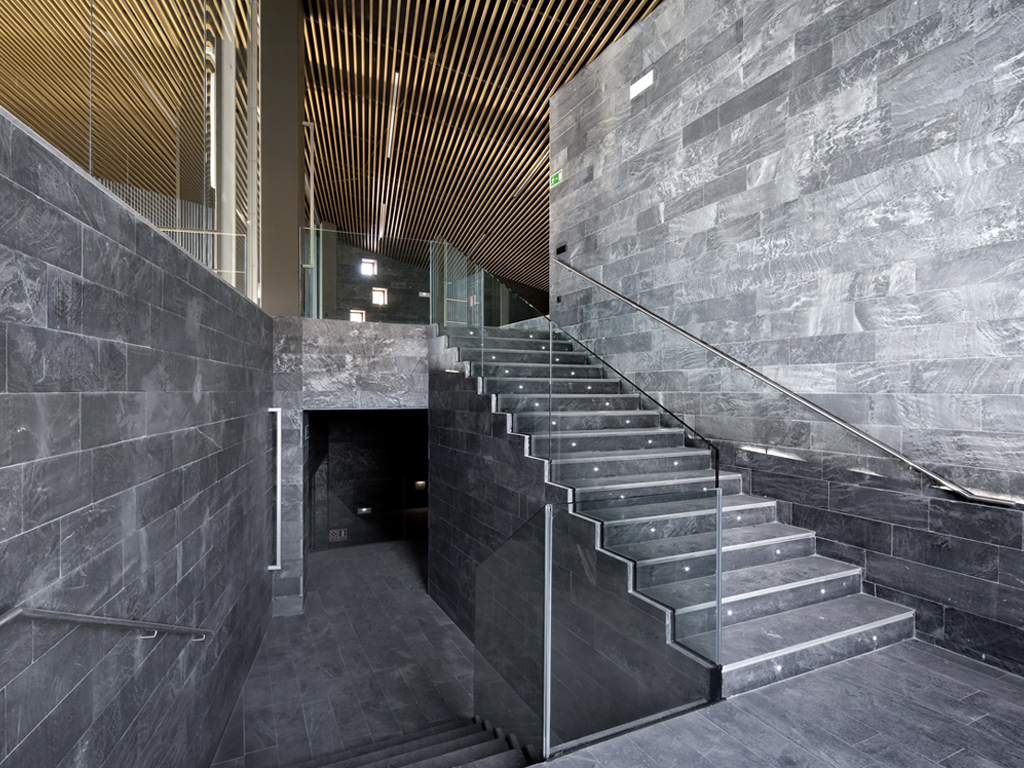 exterior to the dark stone interiors (Grey Phyllite honed), in a didactic tour